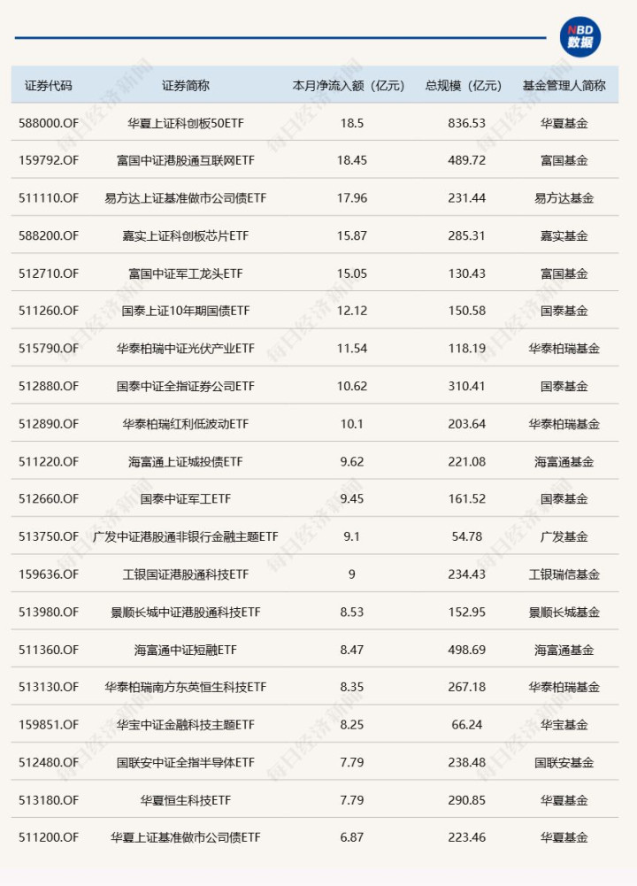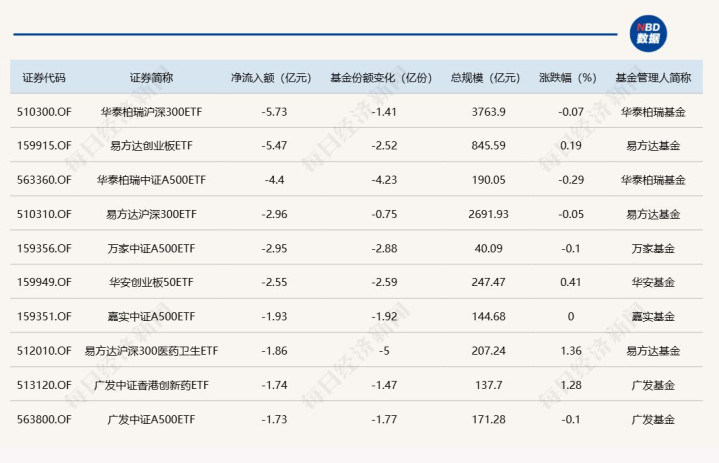 与此同时,华泰柏瑞沪深300ETF基金份额减少1.41亿份,净流出额为5.73亿元;易方达创业板ETF份额减少2.52亿份,净流出额为5.47亿元;华泰柏瑞中证A500ETF份额减少4.23亿份,净流出额为4.4亿元。