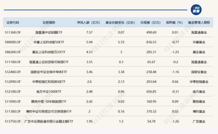 Wind数据显示,在7月9日的非货币ETF市场中,海富通中证短融ETF基金份额增加0.07亿份,净流入额为7.57亿元;华夏上证科创板50ETF份额增加5.72亿份,净流入额为5.94亿元;嘉实上证科创板芯片ETF份额增加3.00亿份,净流入额为4.53亿元。